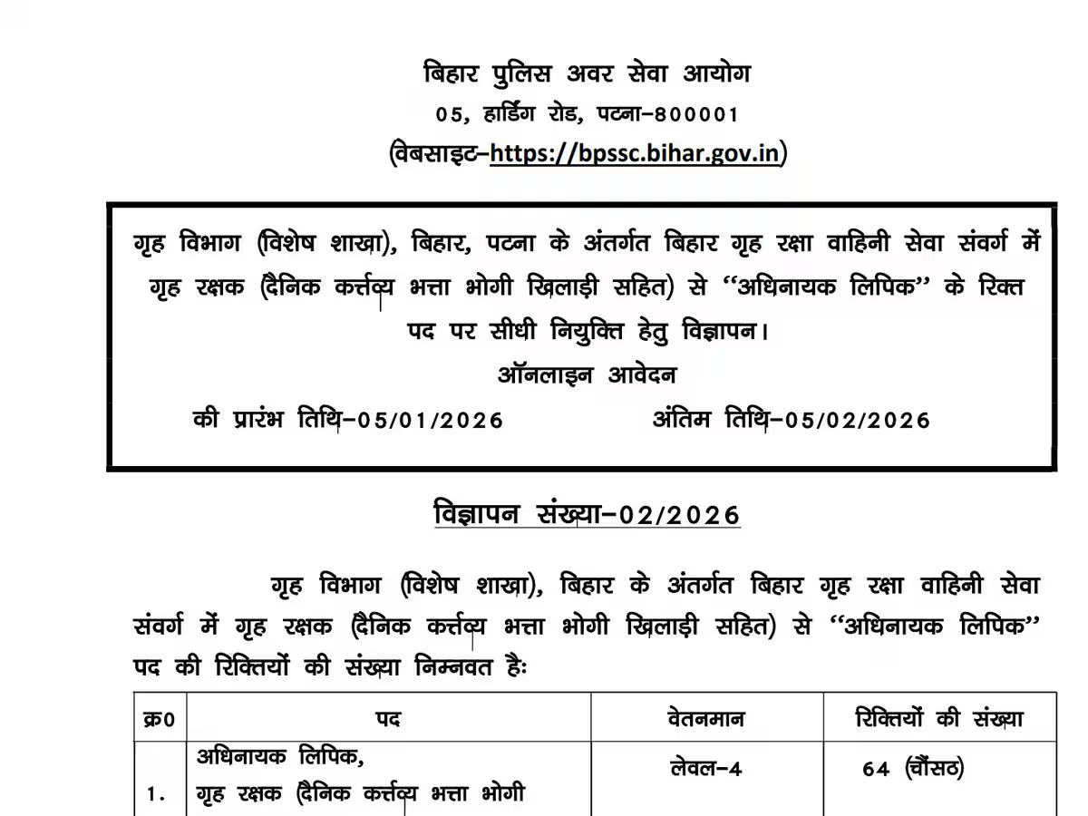 BPSSC Vacancy 2026 : बिहार गृह रक्षा वाहिनी सेवा संवर्ग में गृह रक्षक से अधिनायक लिपिक (हवलदार कलर्क) के 64 ...