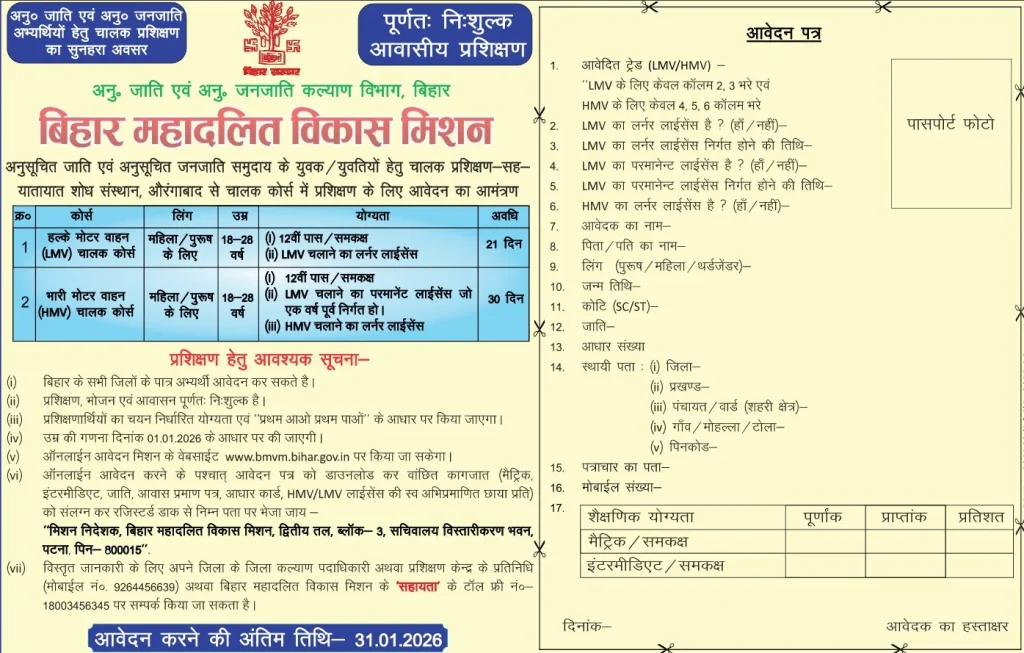 Bihar Free Driver Training Yojana 2026: क्या आप बिहार राज्य के अनुसूचित जाति एवं अनुसूचित जनजाति के युवक या युवती है और आपके पास ड्राइविंग लाइसेंस है और आपको गाड़ी चलानी नहीं आती है और आप गाड़ी चलाना सीखना चाहते है, तो आपके लिए खुशखबरी निकल कर आ रही है क्योंकि बिहार सरकार की ओर से बिहार महा दलित विकास मिशन के शुरुआत की गई है इस मिशन के अंतर्गत अनुसूचित जाति एवं अनुसूचित जनजाति के युवक और युवतियों को निःशुल्क गाड़ी चलाने का प्रशिक्षण प्रदान किया जा रहा है।