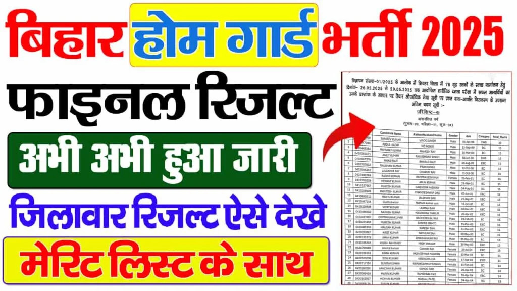 नमस्कार दोस्तों यदि आपने बिहार होमगार्ड भर्ती का फॉर्म भरा है और आपने इसका फिजिकल भी दिया है और आप इसका फाइनल रिजल्ट का इंतजार कर रहे हैं तो आपका इंतजार की घड़ी समाप्त हो चुकी है क्योंकि अलग-अलग जिला बार फाइनल रिजल्ट जारी होना शुरू हो चुका है इस लेख में हम आप सभी को अपना रिजल्ट देखने का पूरा प्रक्रिया बताने जा रहा हूं बस आपको इस लेख को अंत तक पढ़ना है ताकि पूरी जानकारी समझ में आ सके इस लेख के अंत में सभी महत्वपूर्ण लिंक उपलब्ध कराई जाएगी जहां से आप आसानी से Bihar Home Guard Final Result 2025 को देख सकते हैं